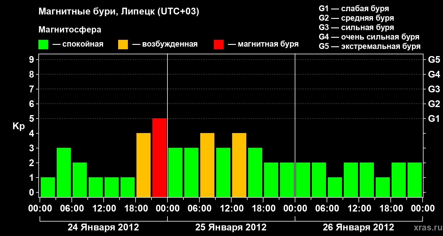 Изменения геомагнитного индекса Kp с 24 по 26 января 2012 года для средних широт