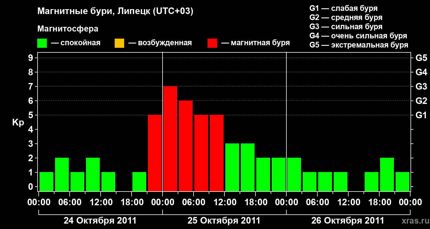 Изменения геомагнитного индекса Kp с 24 по 26 октября 2011 года для средних широт