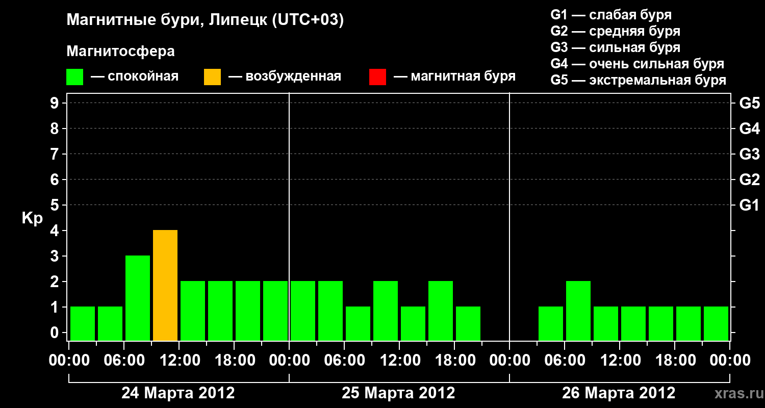 Изменения геомагнитного индекса Kp с 24 по 26 марта 2012 года для средних широт