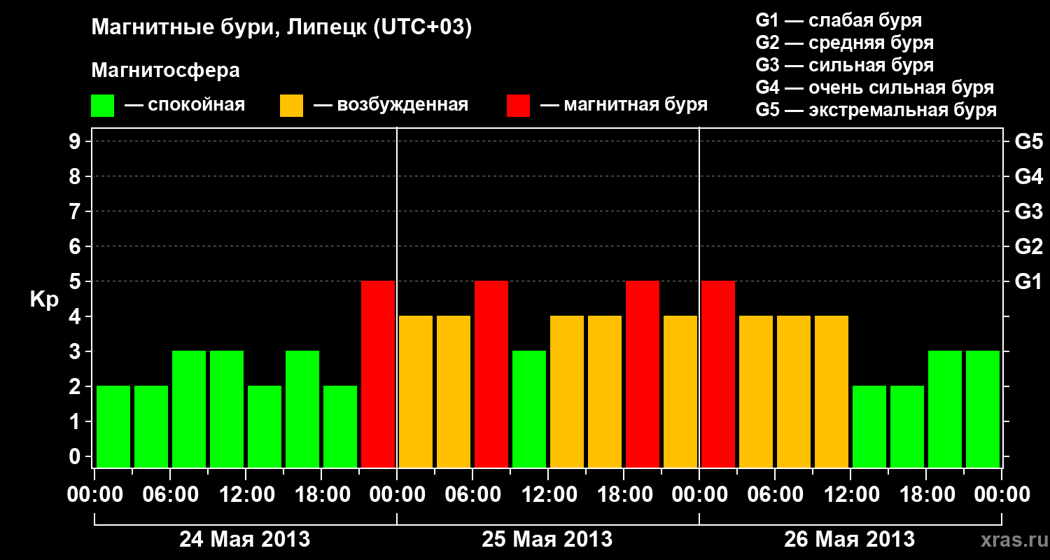 Изменения геомагнитного индекса Kp с 24 по 26 мая 2013 года для средних широт
