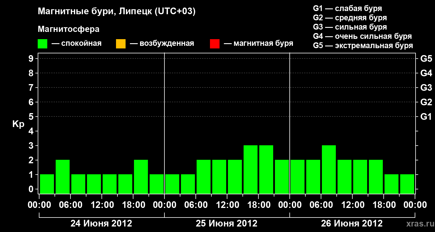 Изменения геомагнитного индекса Kp с 24 по 26 июня 2012 года для средних широт