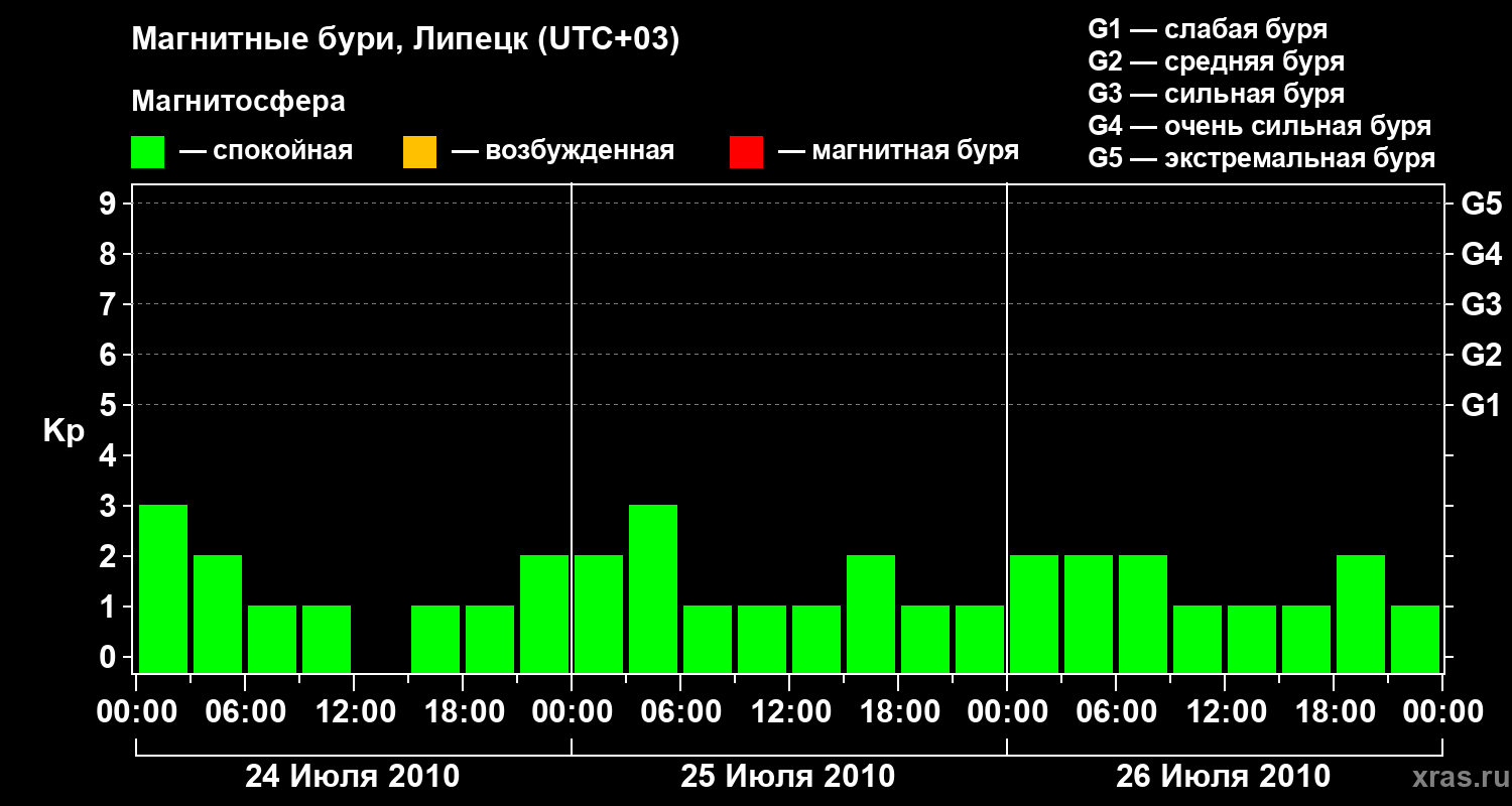 Изменения геомагнитного индекса Kp с 24 по 26 июля 2010 года для средних широт