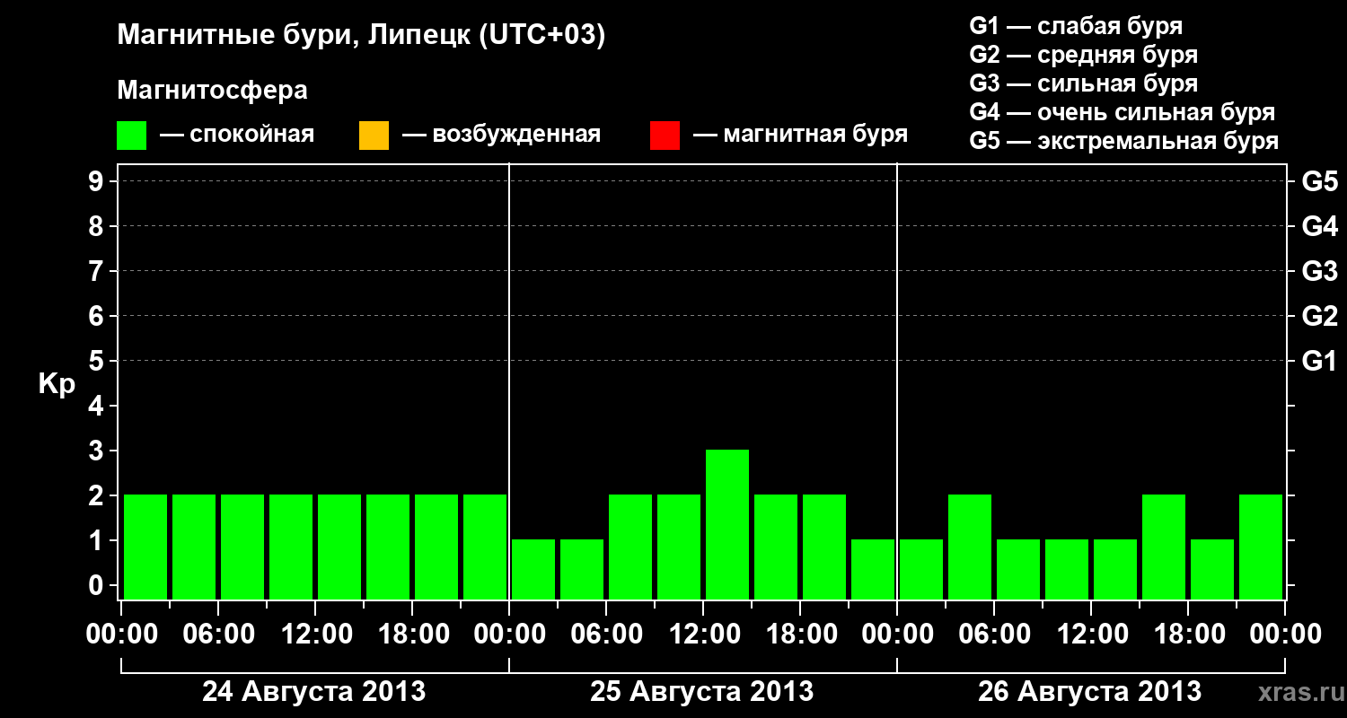 Изменения геомагнитного индекса Kp с 24 по 26 августа 2013 года для средних широт