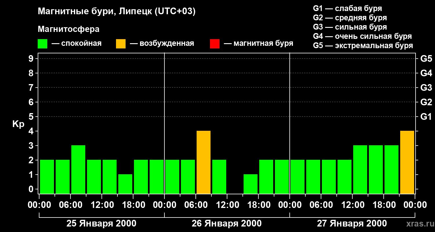 Изменения геомагнитного индекса Kp с 25 по 27 января 2000 года для средних широт