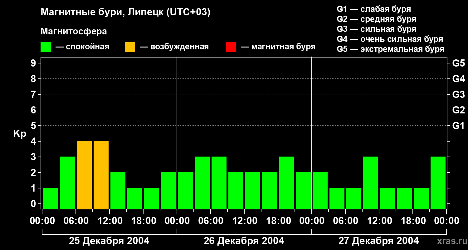 Изменения геомагнитного индекса Kp с 25 по 27 декабря 2004 года для средних широт