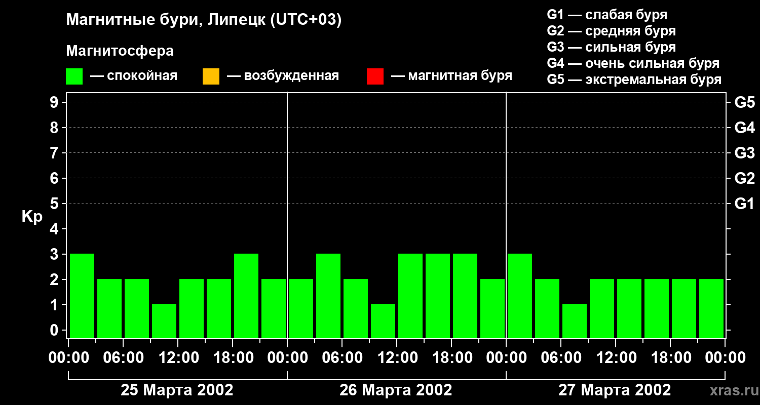 Изменения геомагнитного индекса Kp с 25 по 27 марта 2002 года для средних широт