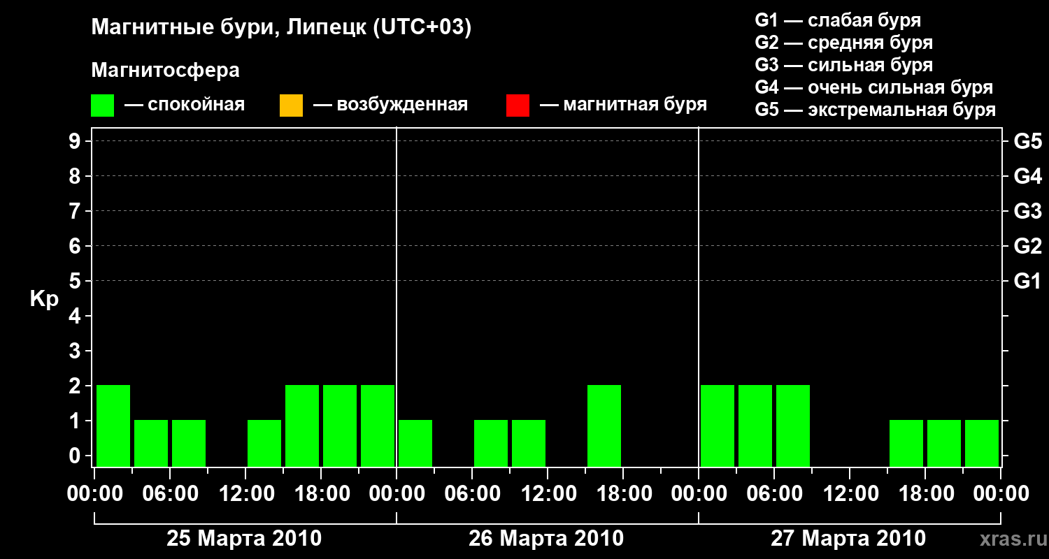 Изменения геомагнитного индекса Kp с 25 по 27 марта 2010 года для средних широт