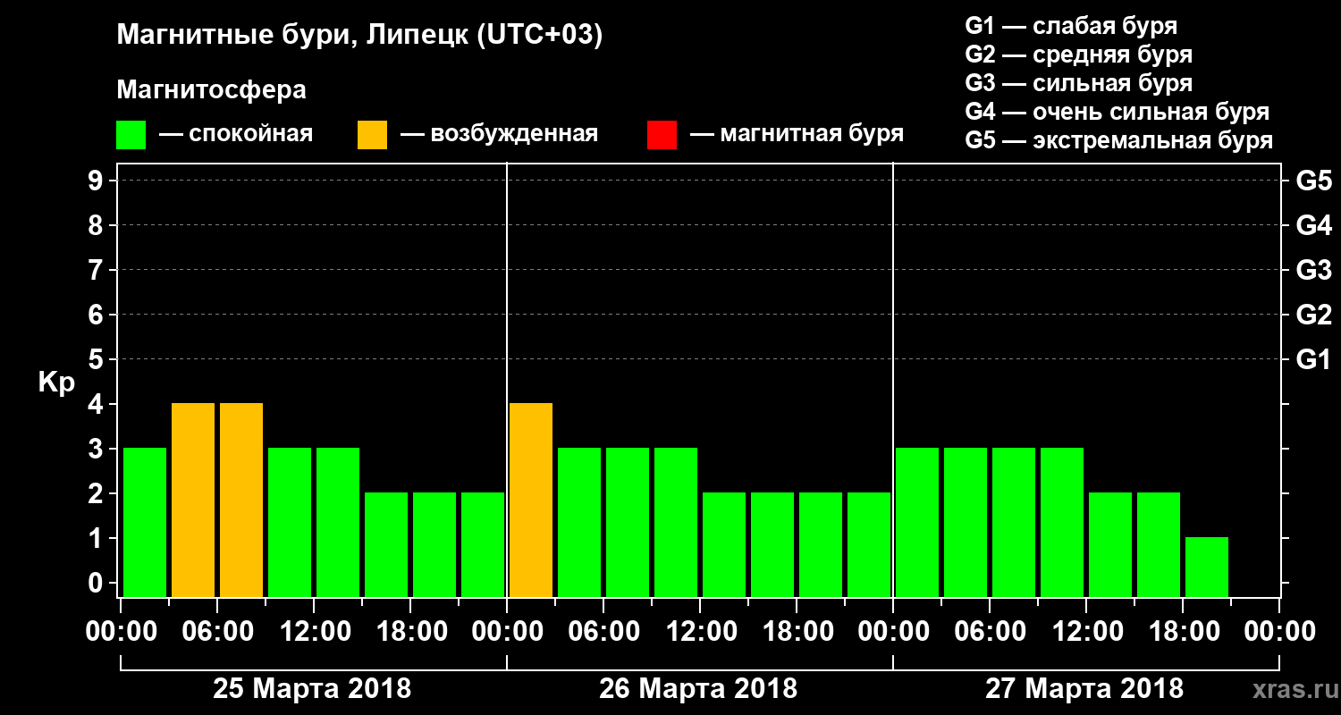 Изменения геомагнитного индекса Kp с 25 по 27 марта 2018 года для средних широт