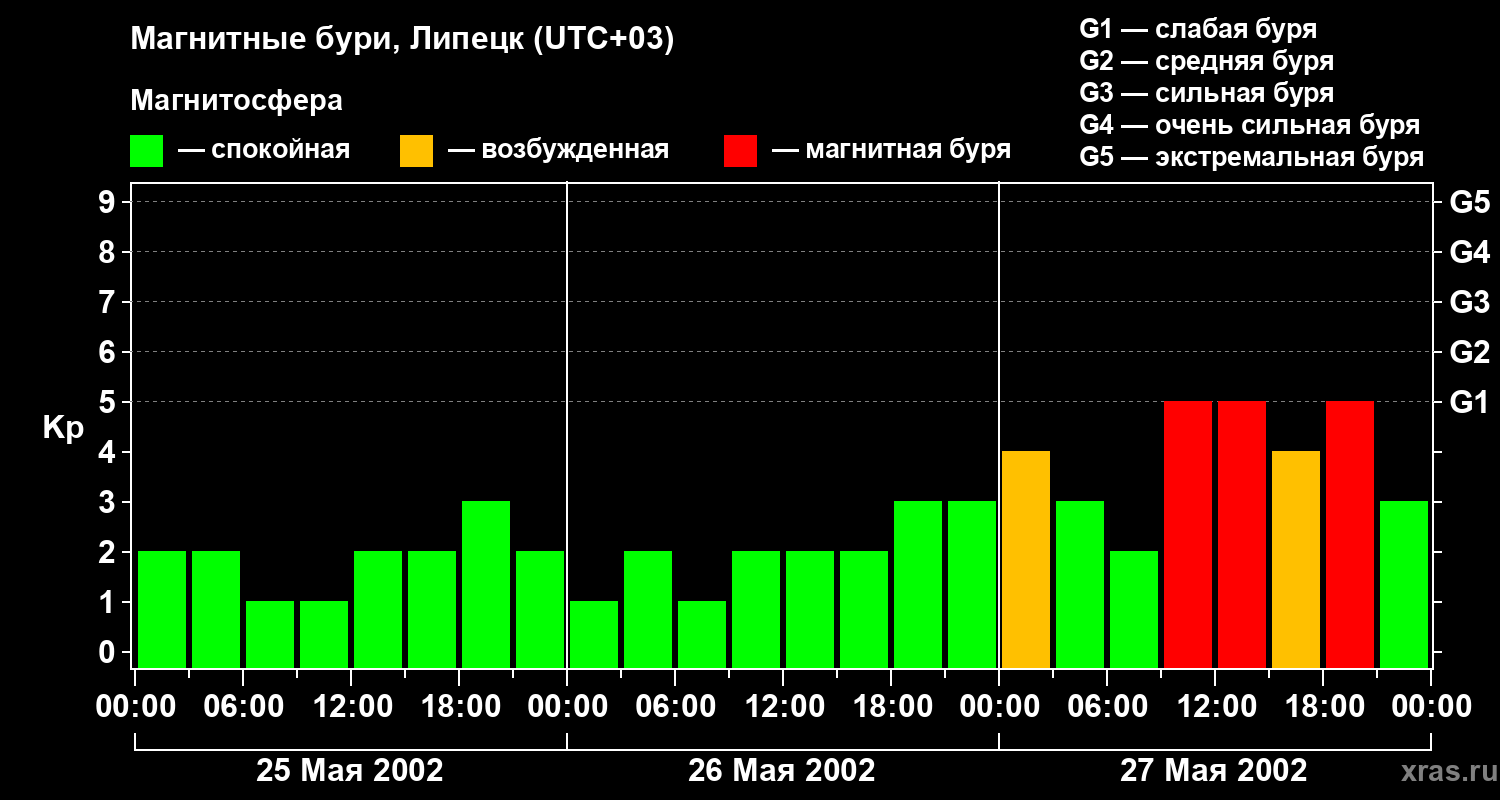 Изменения геомагнитного индекса Kp с 25 по 27 мая 2002 года для средних широт