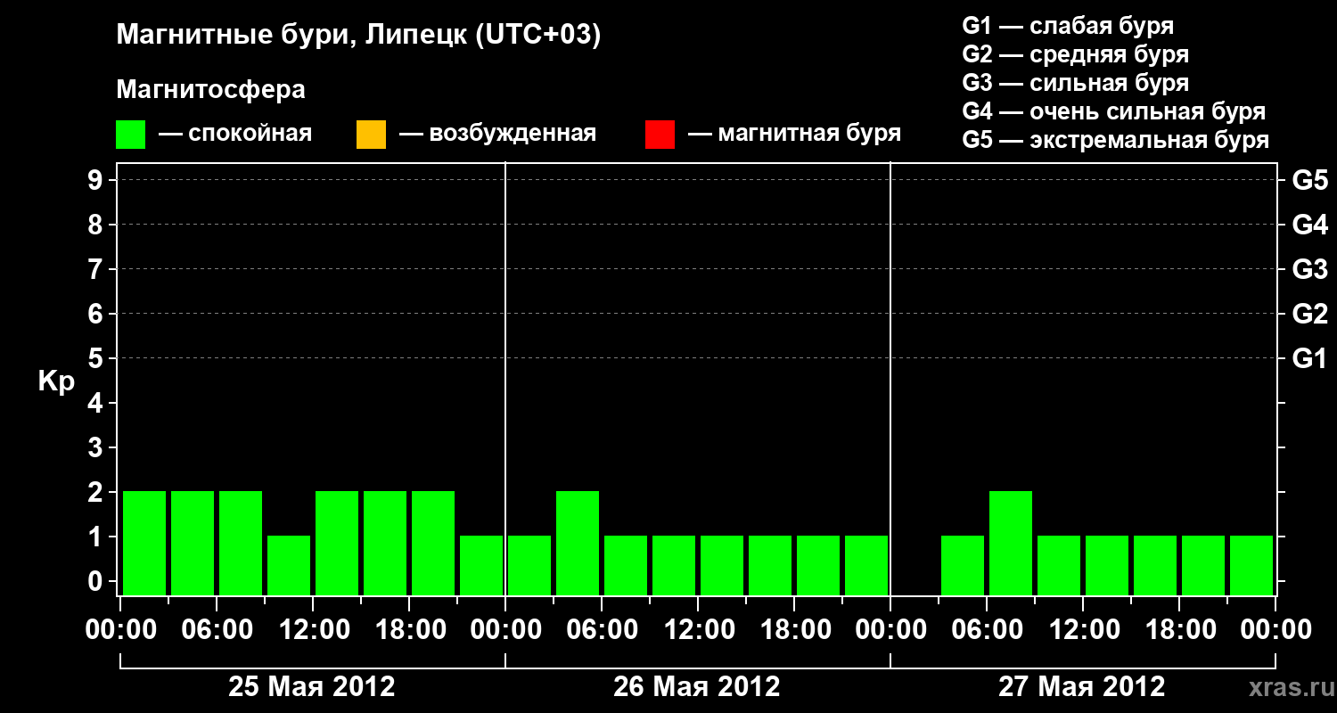 Изменения геомагнитного индекса Kp с 25 по 27 мая 2012 года для средних широт