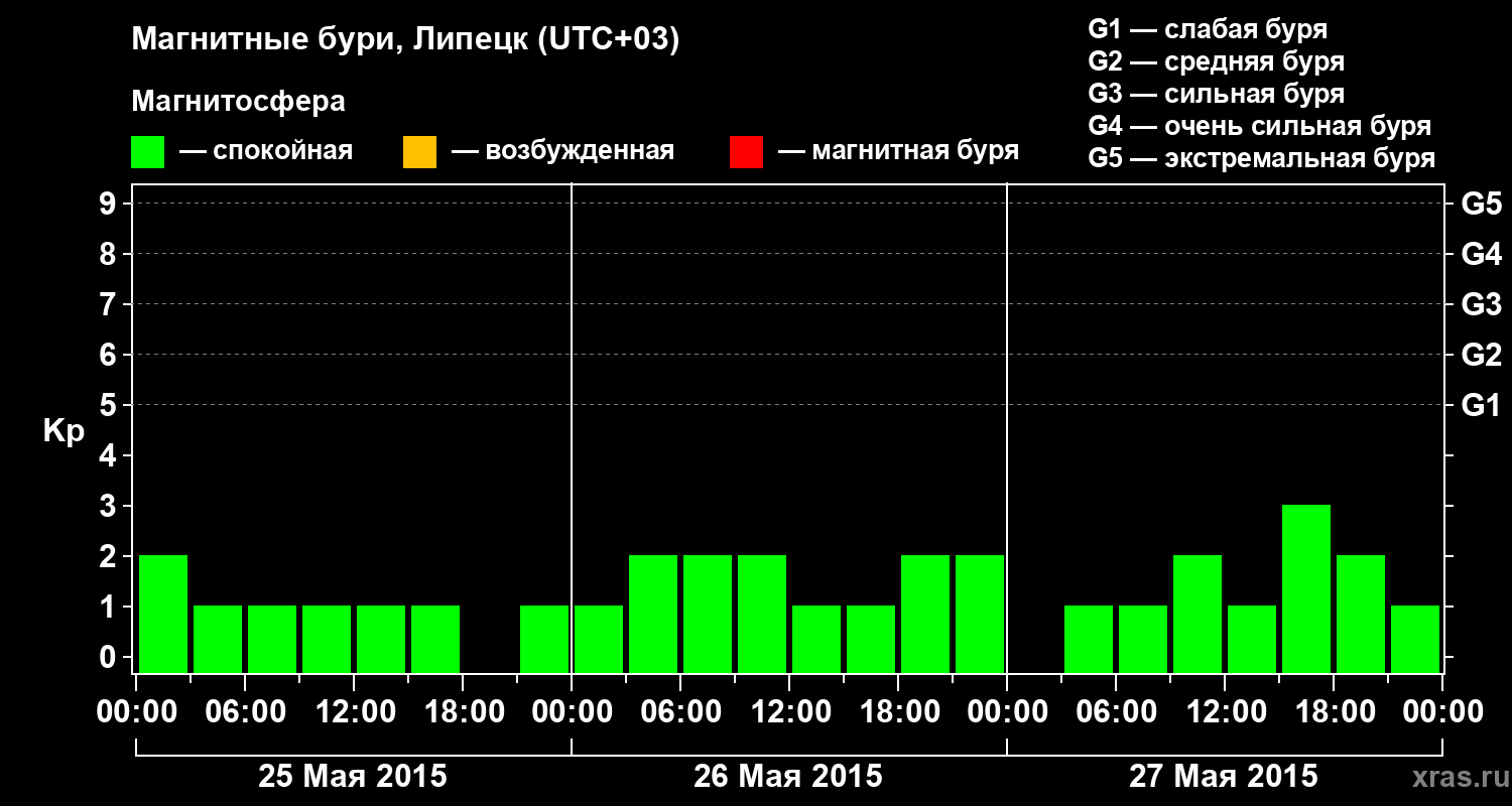 Изменения геомагнитного индекса Kp с 25 по 27 мая 2015 года для средних широт