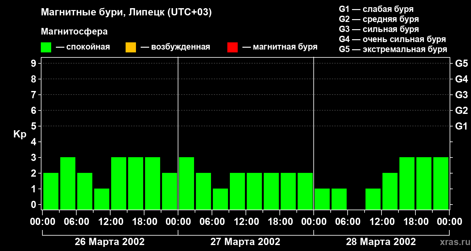 Изменения геомагнитного индекса Kp с 26 по 28 марта 2002 года для средних широт