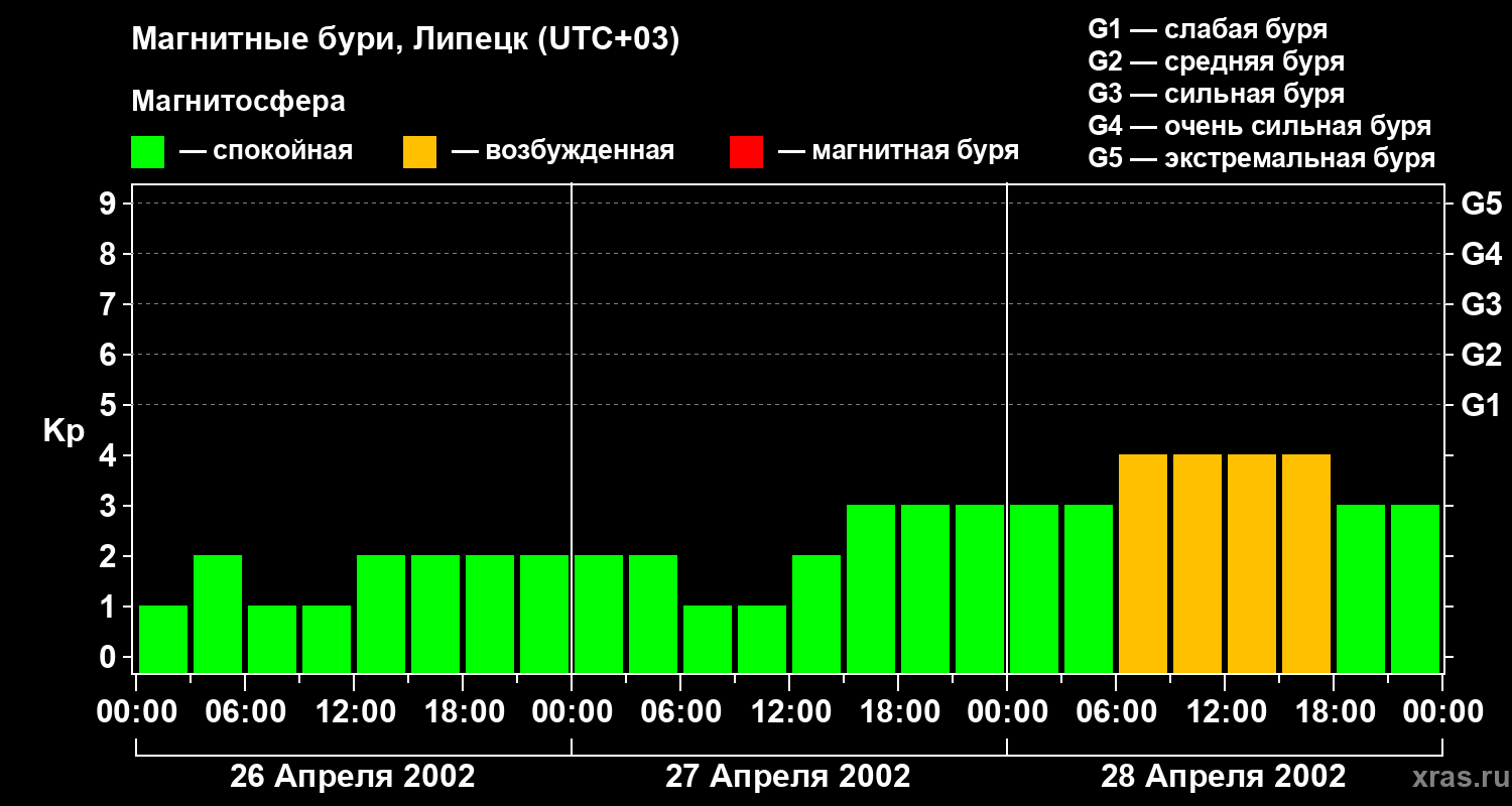 Изменения геомагнитного индекса Kp с 26 по 28 апреля 2002 года для средних широт