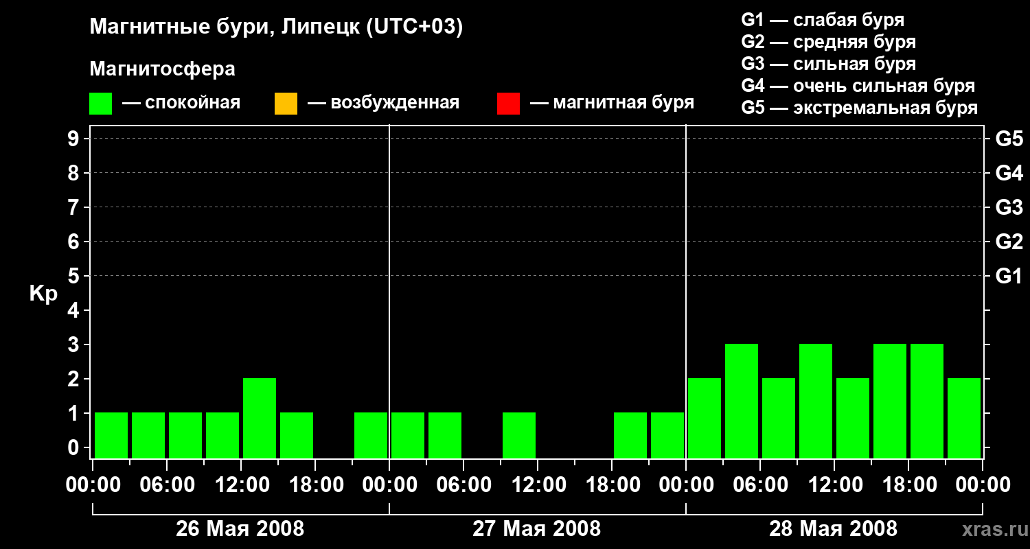 Изменения геомагнитного индекса Kp с 26 по 28 мая 2008 года для средних широт