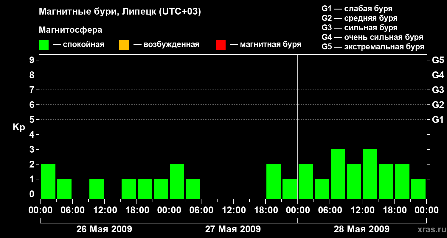 Изменения геомагнитного индекса Kp с 26 по 28 мая 2009 года для средних широт