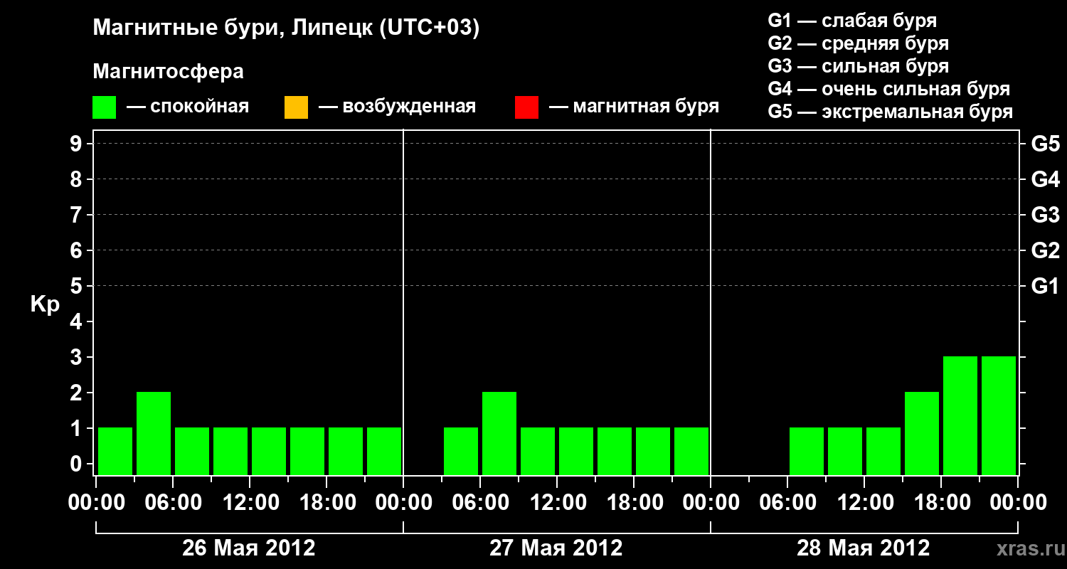 Изменения геомагнитного индекса Kp с 26 по 28 мая 2012 года для средних широт