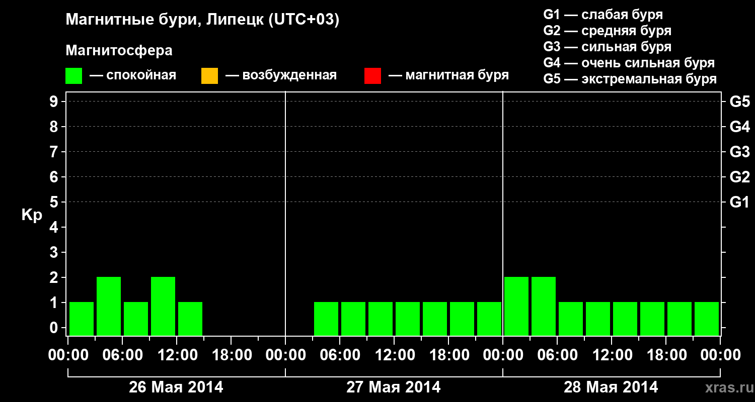 Изменения геомагнитного индекса Kp с 26 по 28 мая 2014 года для средних широт