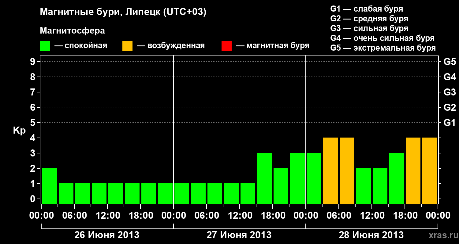 Изменения геомагнитного индекса Kp с 26 по 28 июня 2013 года для средних широт
