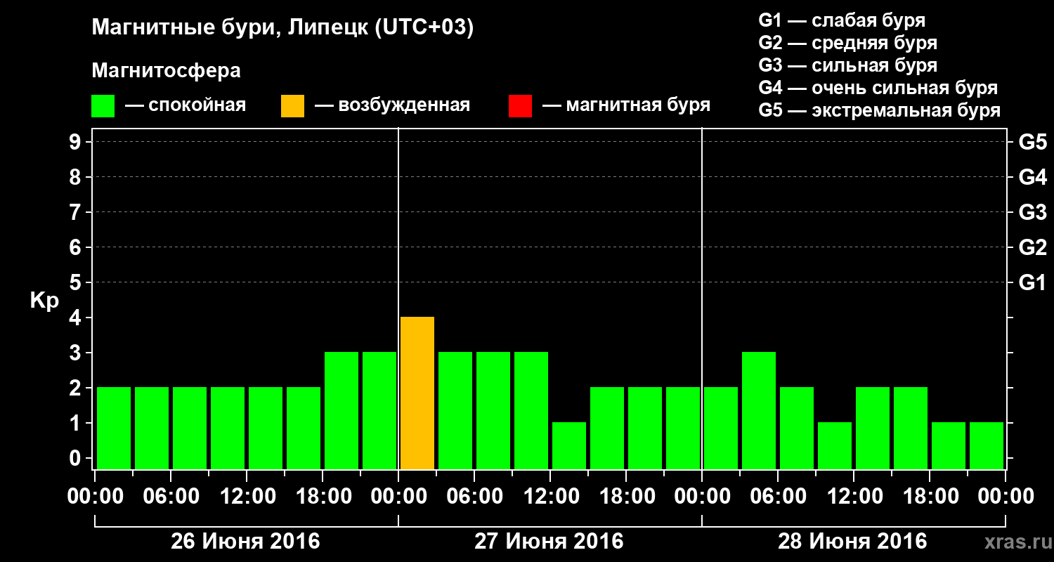 Изменения геомагнитного индекса Kp с 26 по 28 июня 2016 года для средних широт