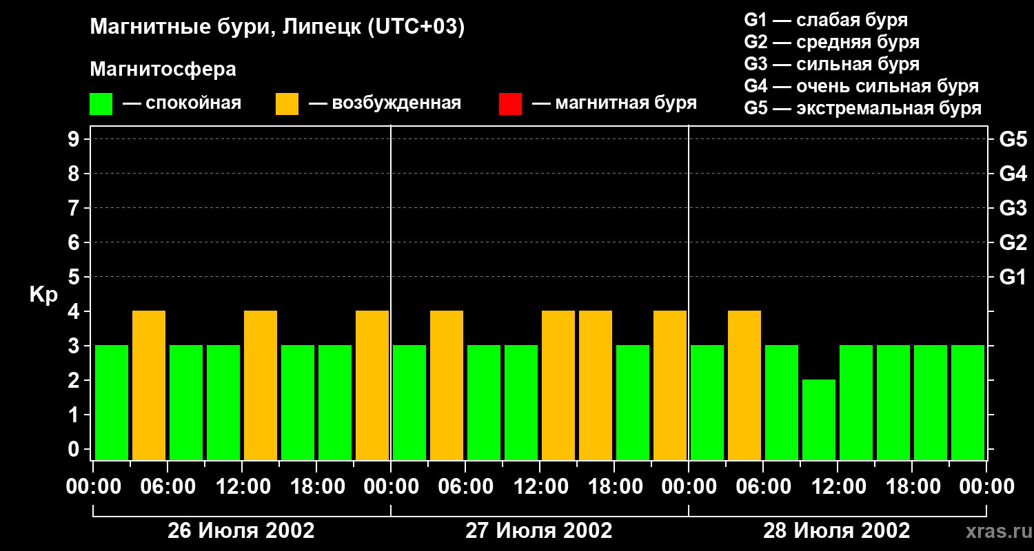 Изменения геомагнитного индекса Kp с 26 по 28 июля 2002 года для средних широт