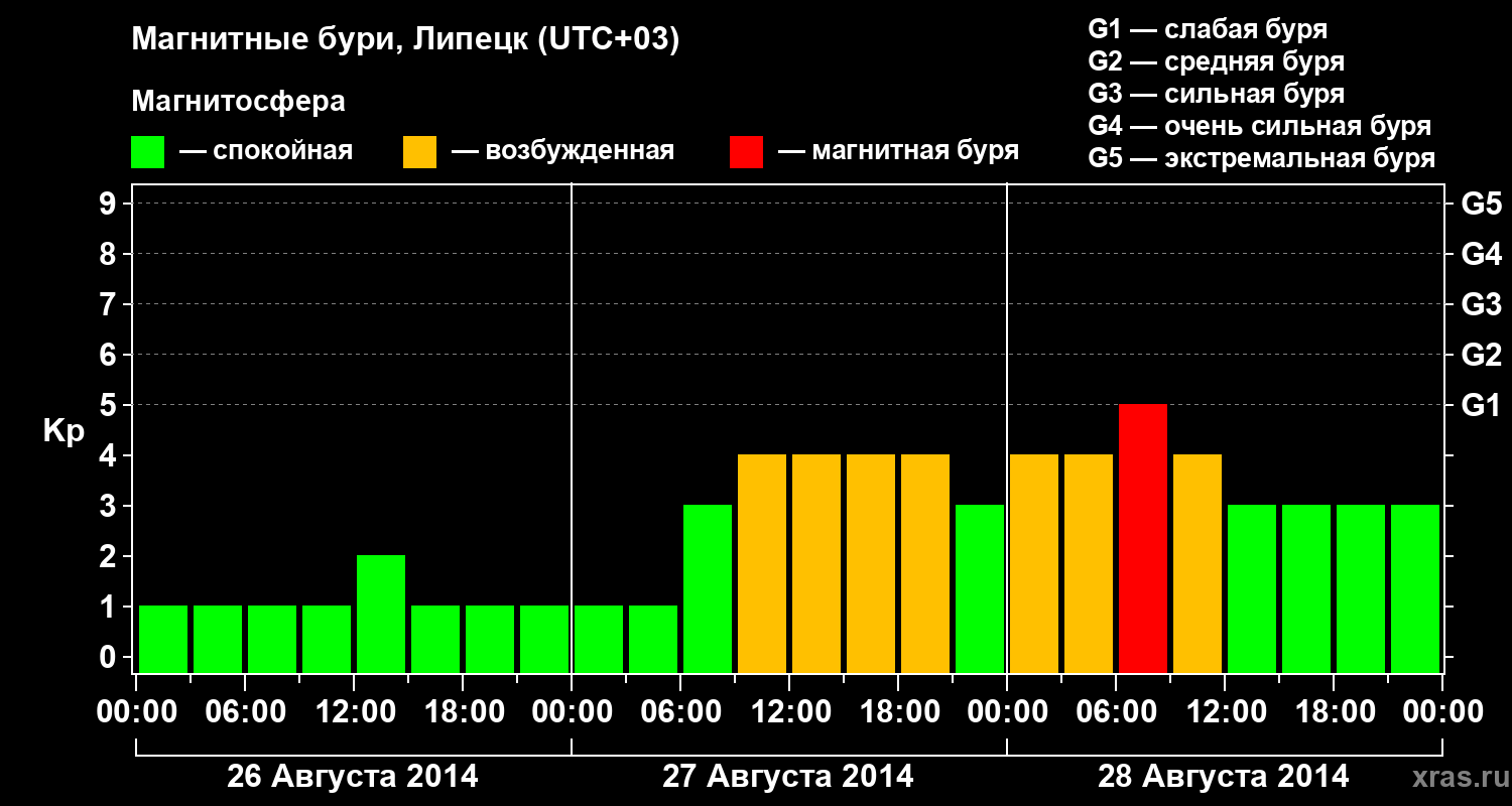 Изменения геомагнитного индекса Kp с 26 по 28 августа 2014 года для средних широт