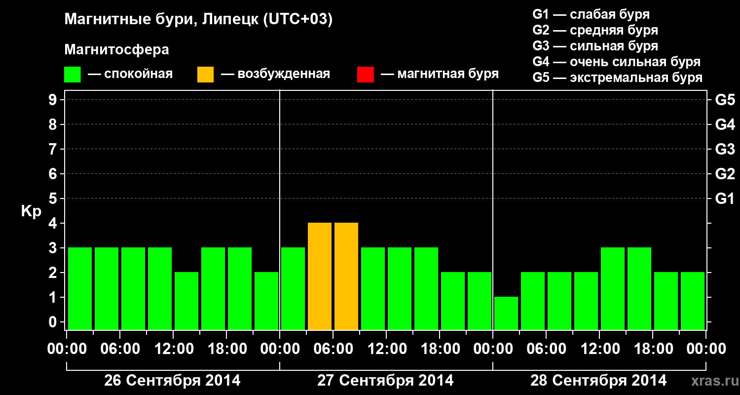 Изменения геомагнитного индекса Kp с 26 по 28 сентября 2014 года для средних широт