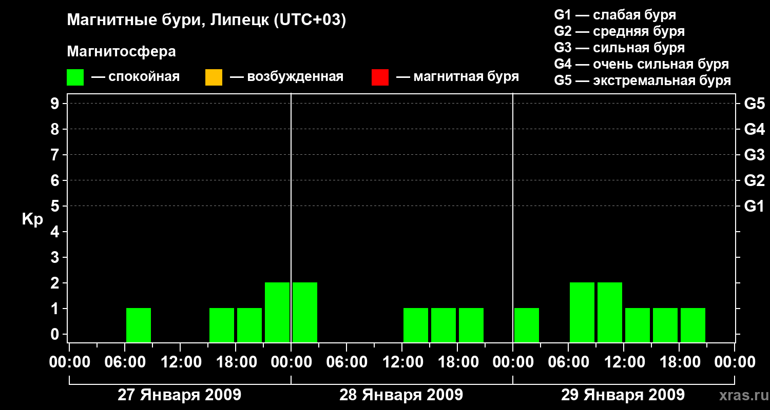 Изменения геомагнитного индекса Kp с 27 по 29 января 2009 года для средних широт