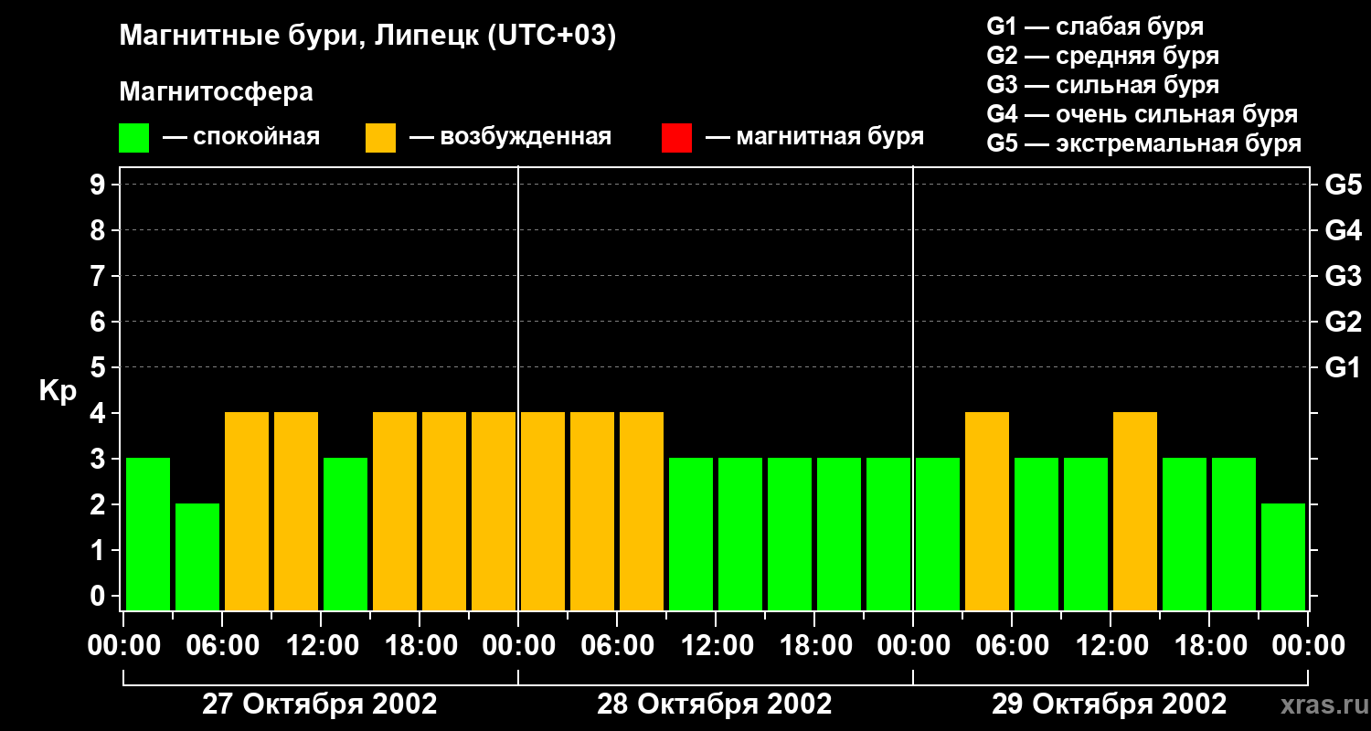 Изменения геомагнитного индекса Kp с 27 по 29 октября 2002 года для средних широт
