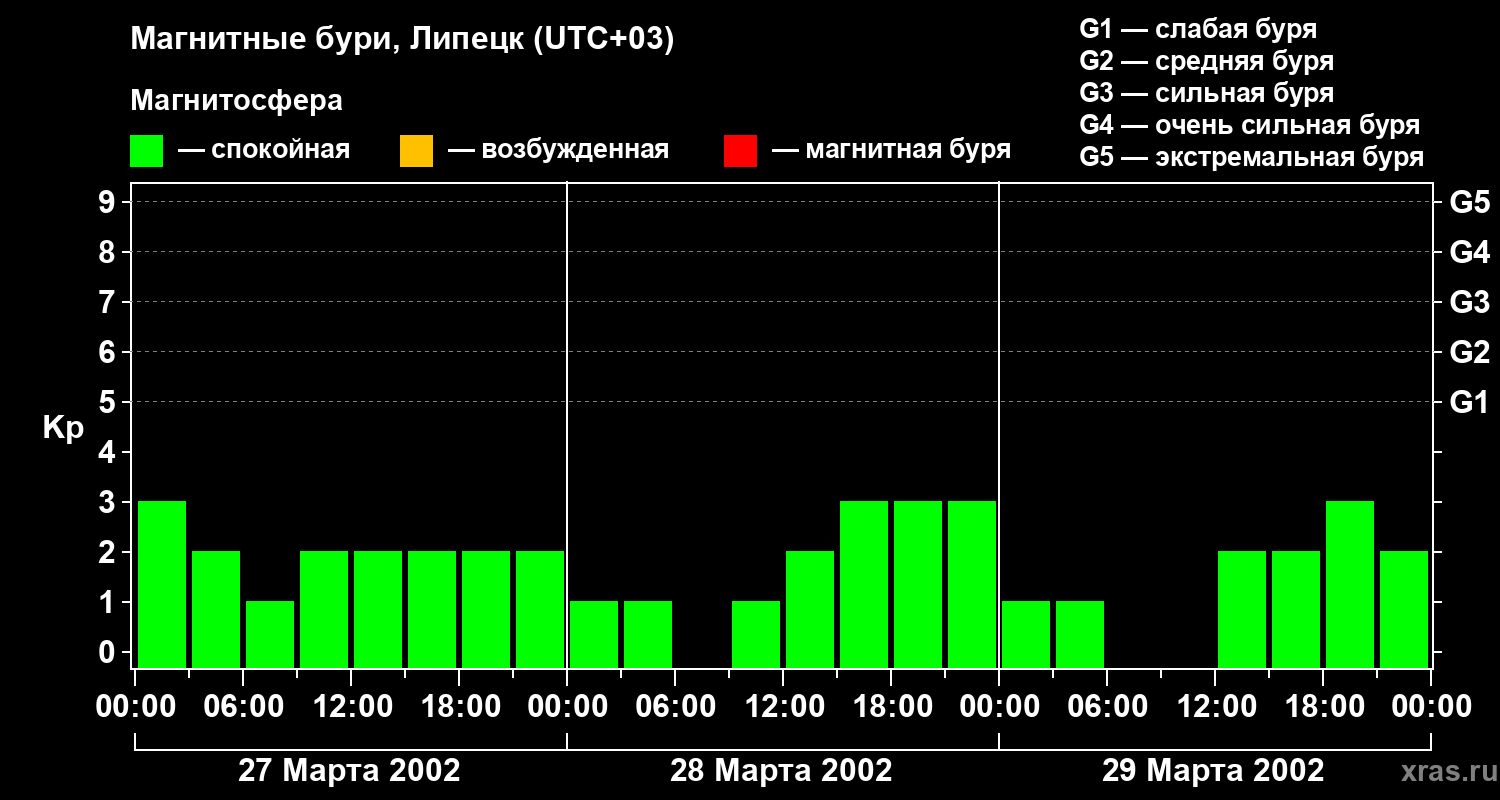 Изменения геомагнитного индекса Kp с 27 по 29 марта 2002 года для средних широт