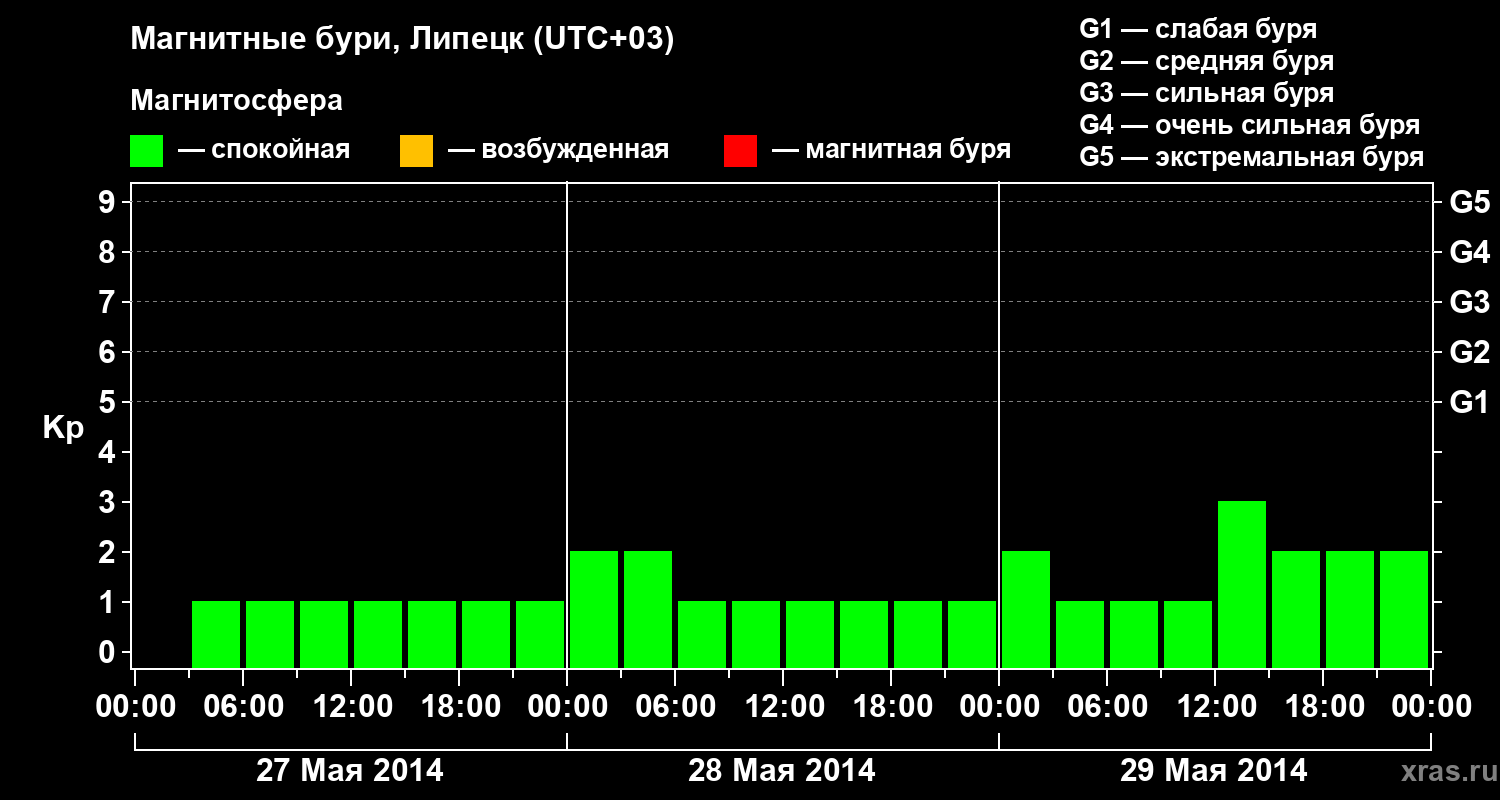 Изменения геомагнитного индекса Kp с 27 по 29 мая 2014 года для средних широт