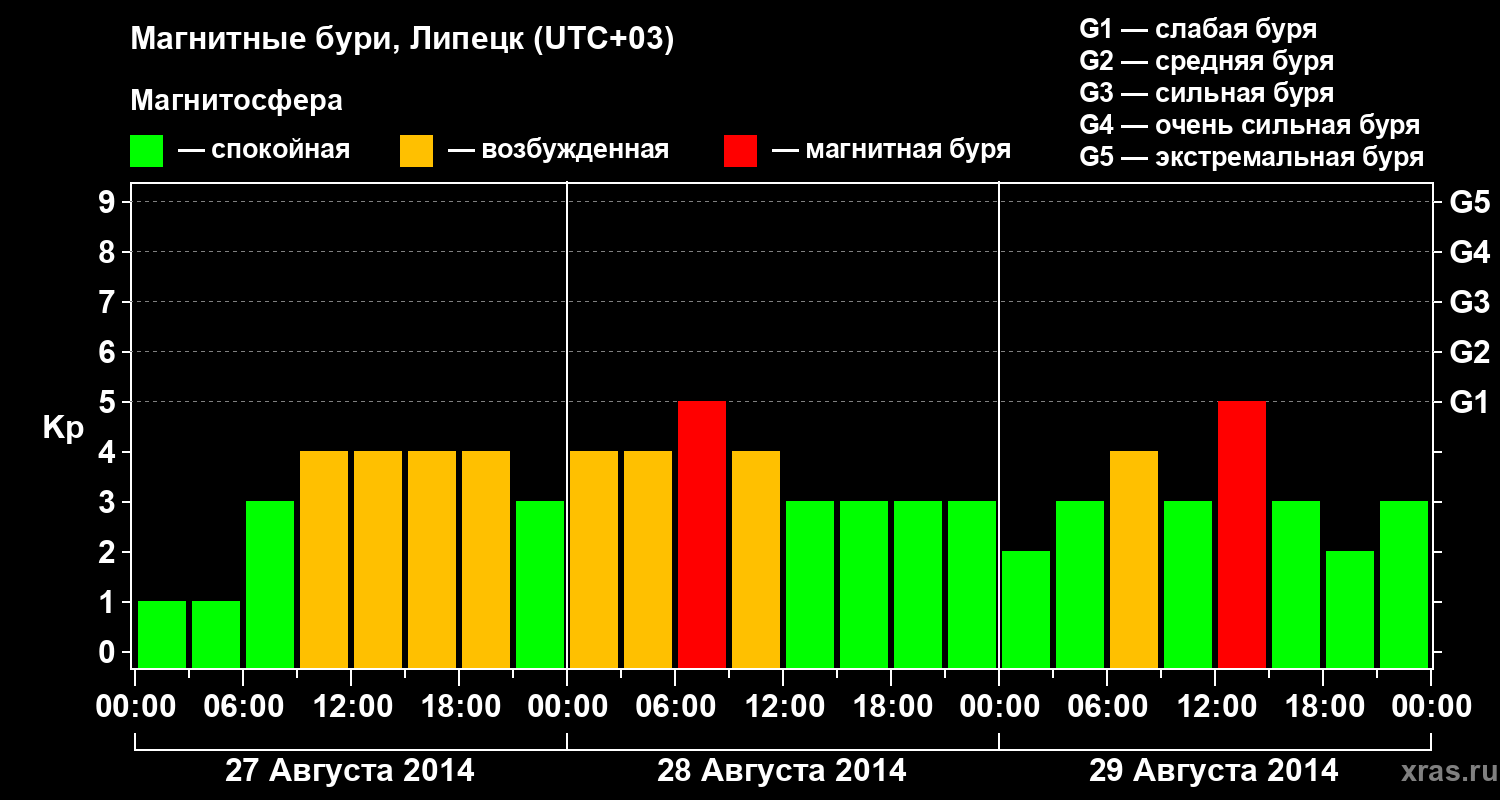Изменения геомагнитного индекса Kp с 27 по 29 августа 2014 года для средних широт