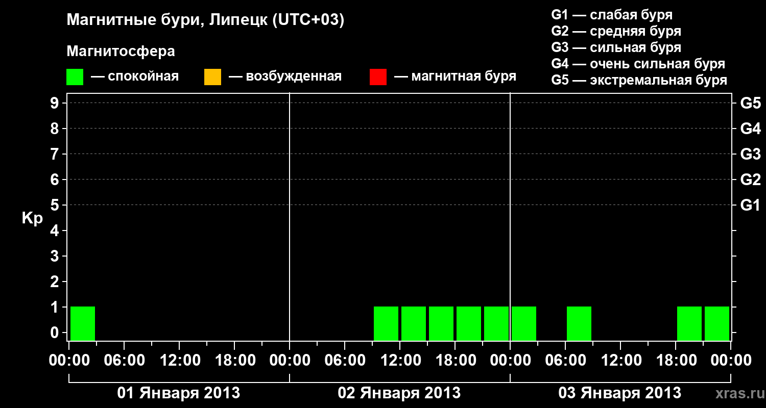Изменения геомагнитного индекса Kp с 1 по 3 января 2013 года для средних широт