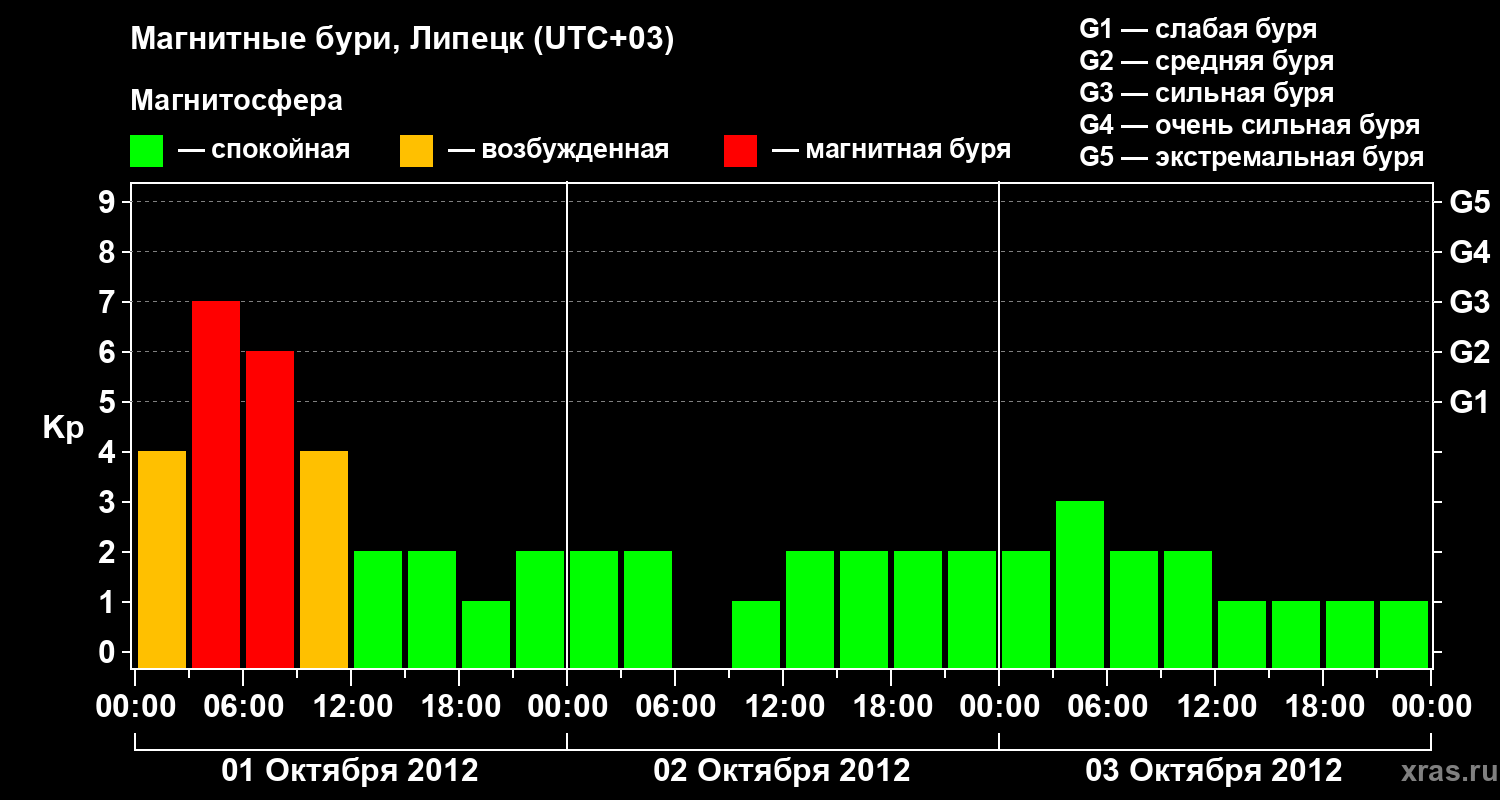 Изменения геомагнитного индекса Kp с 1 по 3 октября 2012 года для средних широт