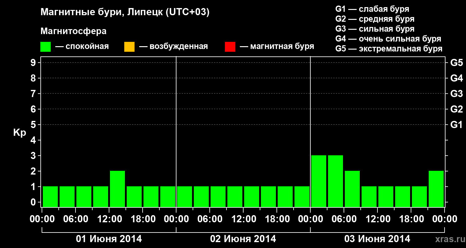 Изменения геомагнитного индекса Kp с 1 по 3 июня 2014 года для средних широт