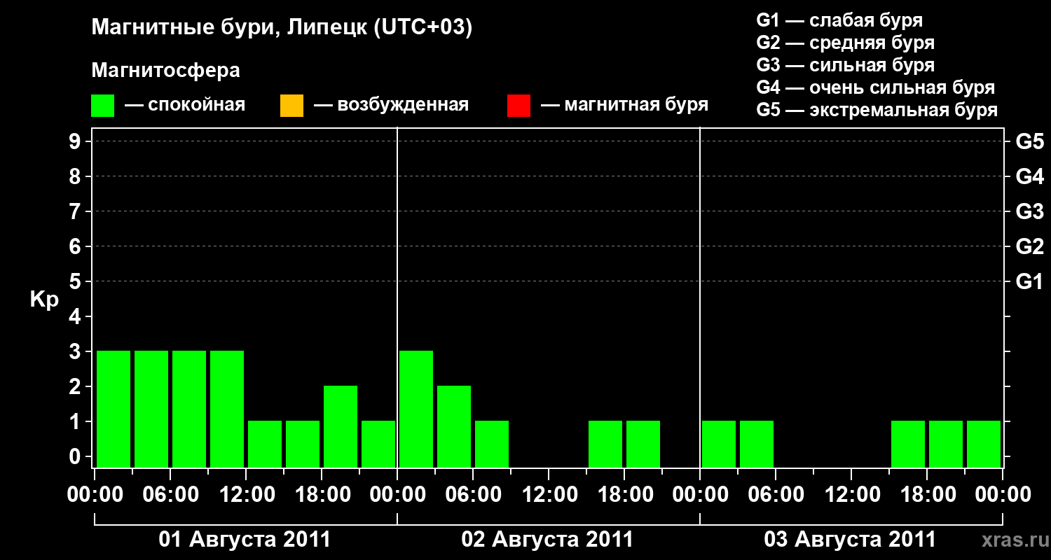 Изменения геомагнитного индекса Kp с 1 по 3 августа 2011 года для средних широт