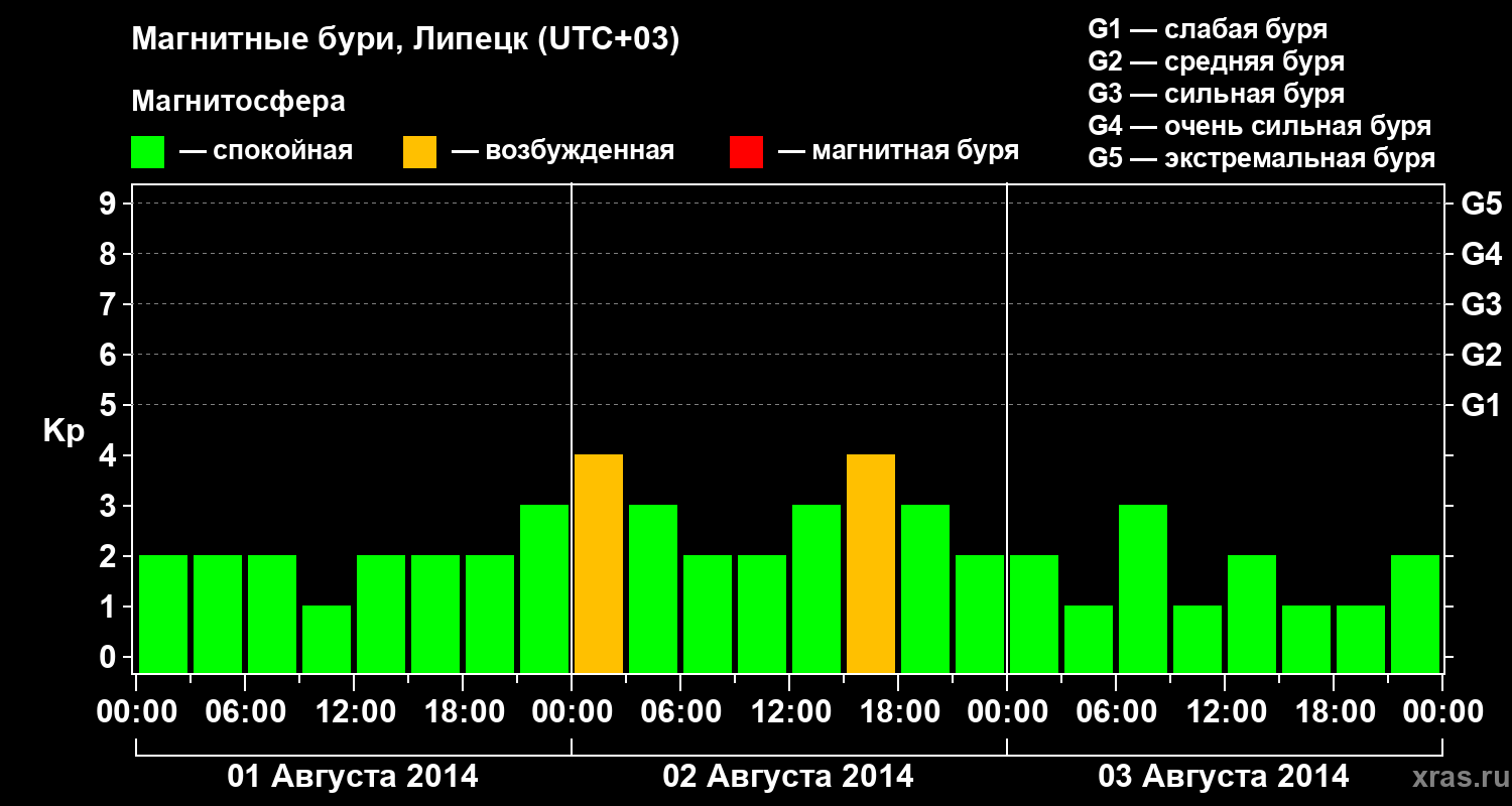 Изменения геомагнитного индекса Kp с 1 по 3 августа 2014 года для средних широт