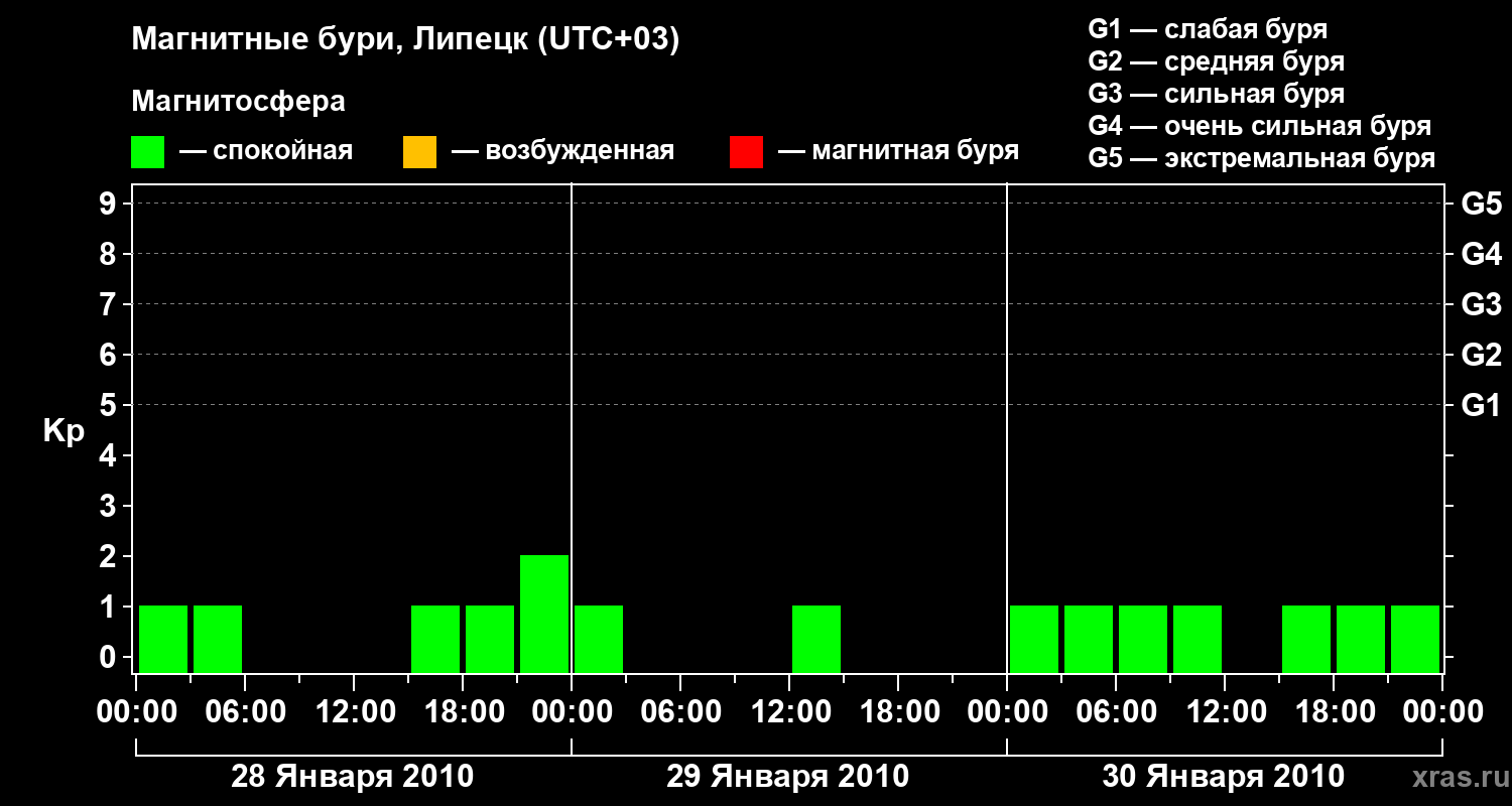 Изменения геомагнитного индекса Kp с 28 по 30 января 2010 года для средних широт