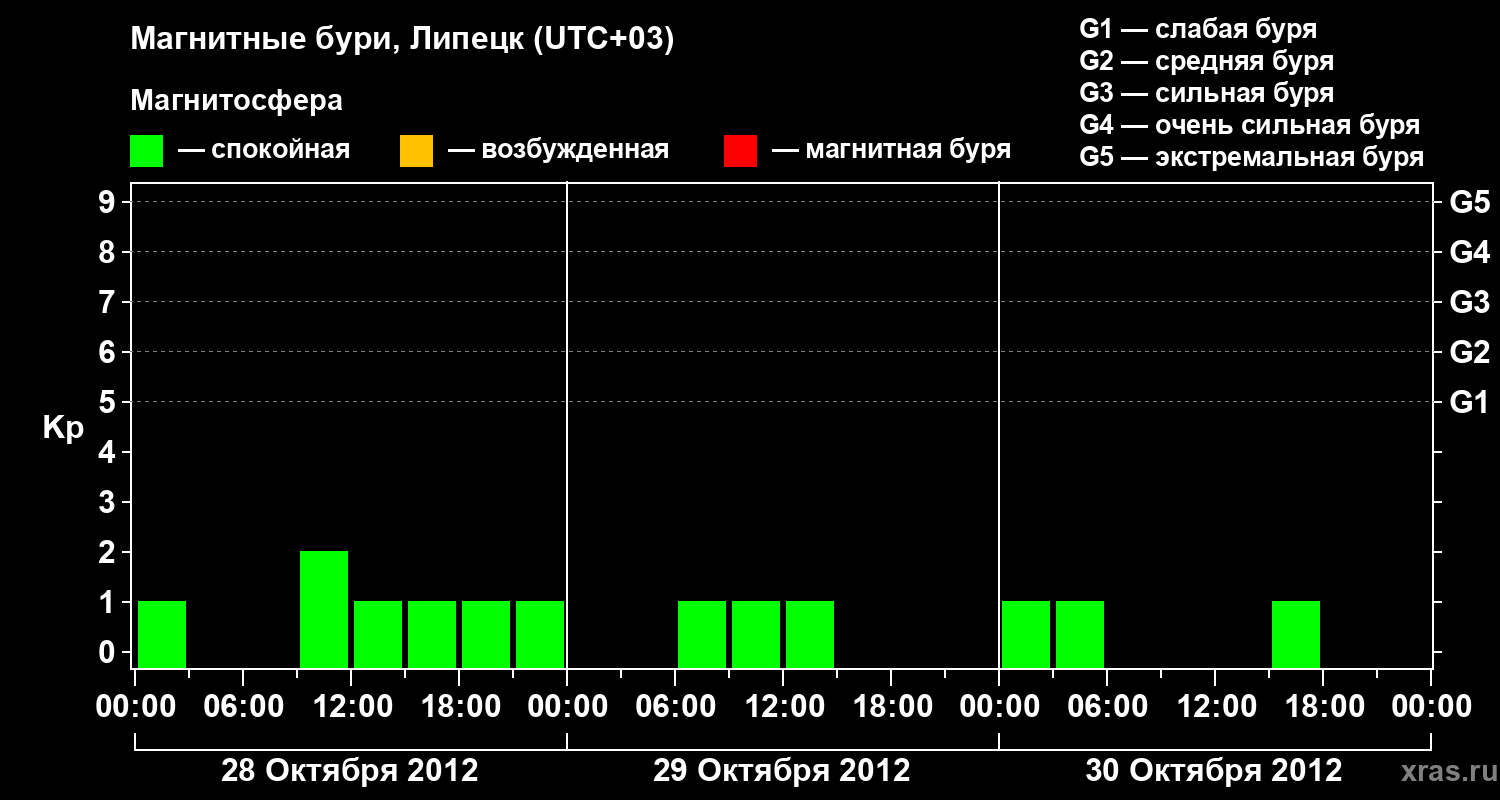 Изменения геомагнитного индекса Kp с 28 по 30 октября 2012 года для средних широт