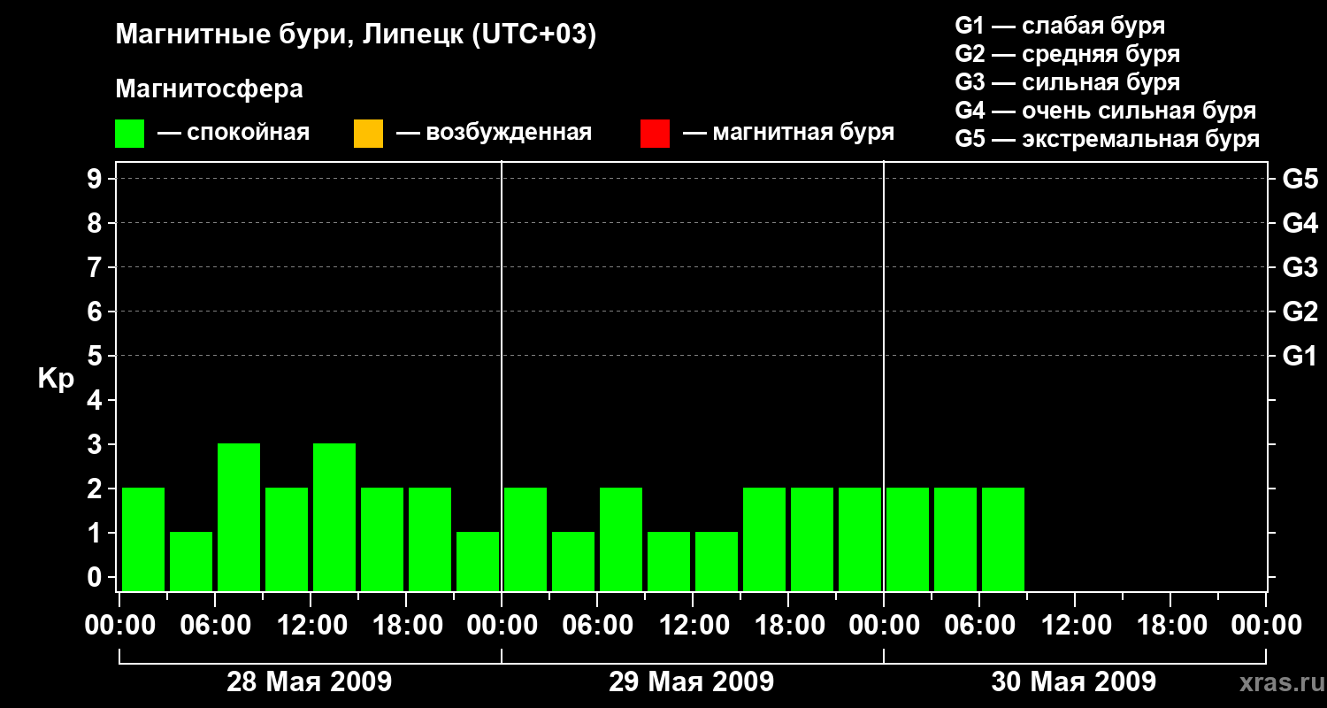 Изменения геомагнитного индекса Kp с 28 по 30 мая 2009 года для средних широт
