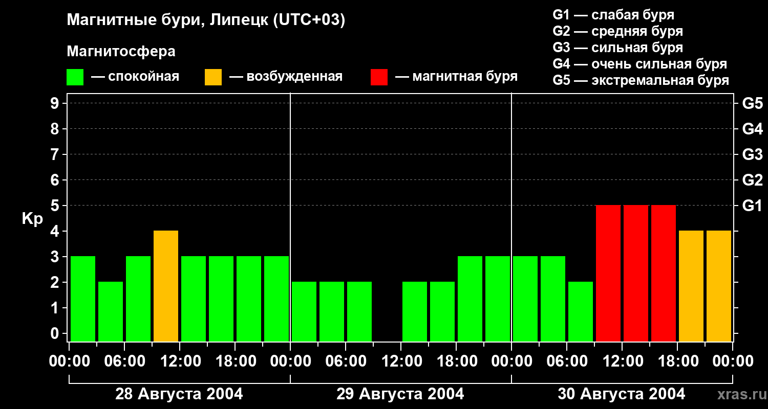 Изменения геомагнитного индекса Kp с 28 по 30 августа 2004 года для средних широт
