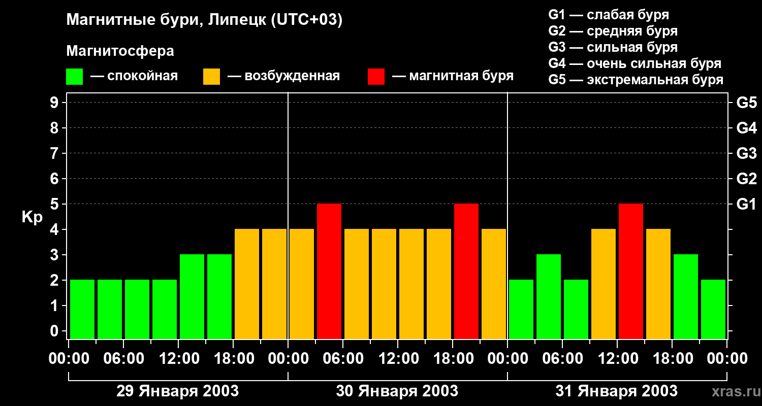 Изменения геомагнитного индекса Kp с 29 по 31 января 2003 года для средних широт