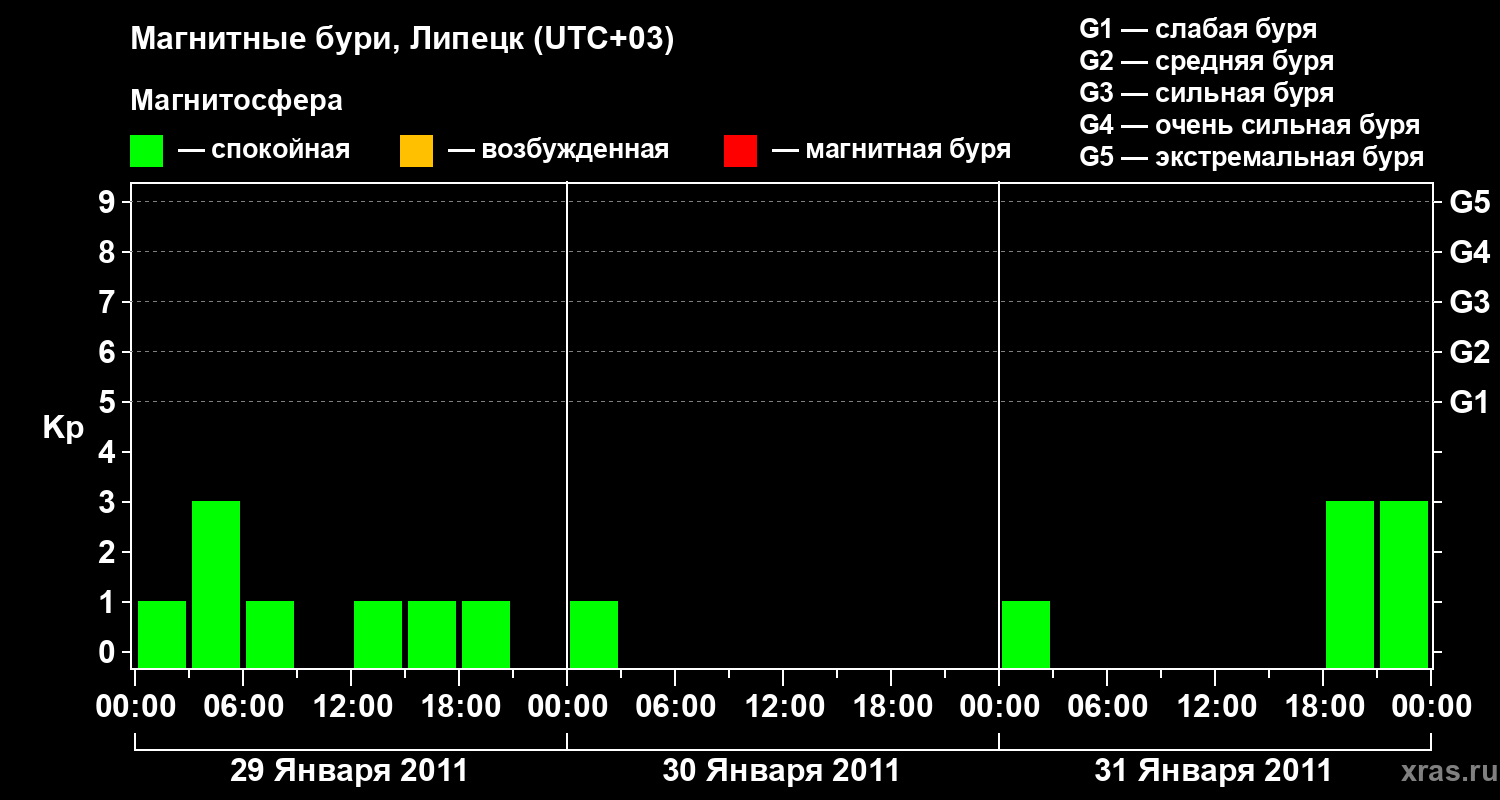 Изменения геомагнитного индекса Kp с 29 по 31 января 2011 года для средних широт