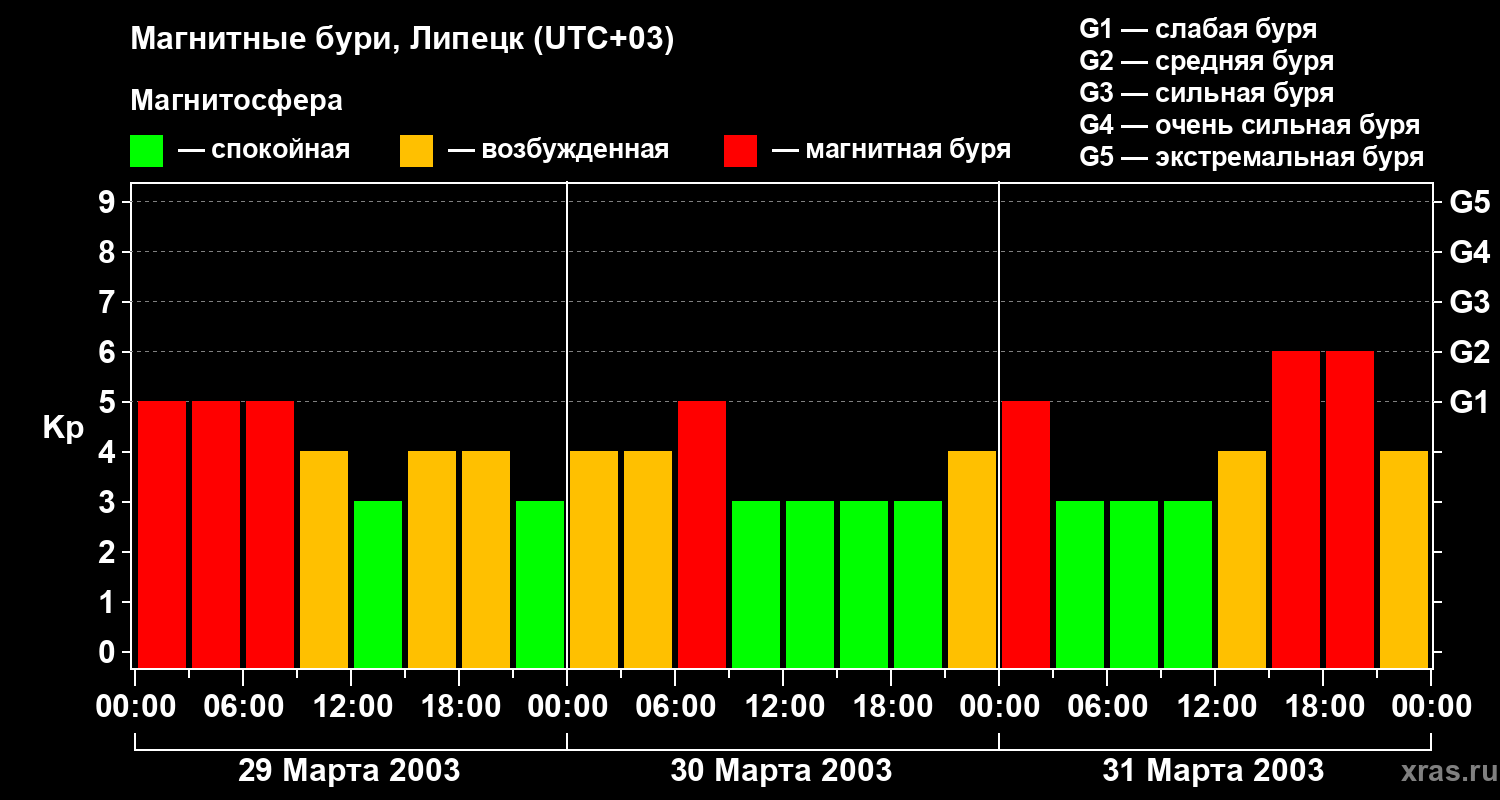 Изменения геомагнитного индекса Kp с 29 по 31 марта 2003 года для средних широт