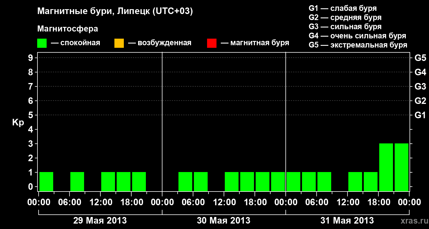 Изменения геомагнитного индекса Kp с 29 по 31 мая 2013 года для средних широт