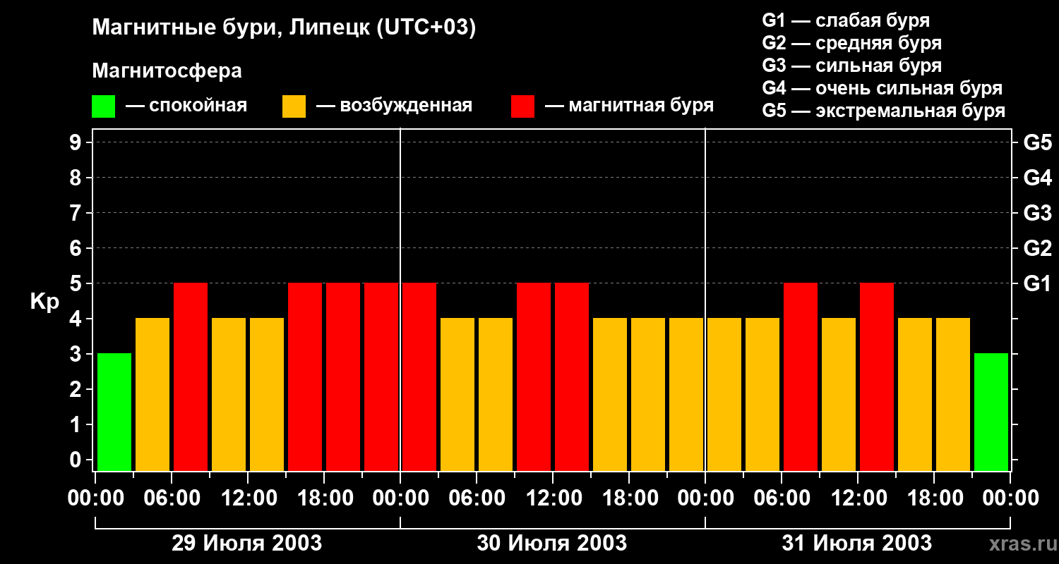 Изменения геомагнитного индекса Kp с 29 по 31 июля 2003 года для средних широт