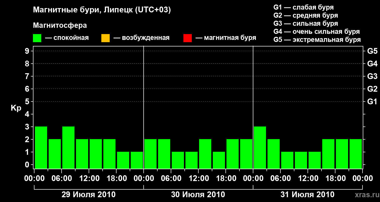 Изменения геомагнитного индекса Kp с 29 по 31 июля 2010 года для средних широт