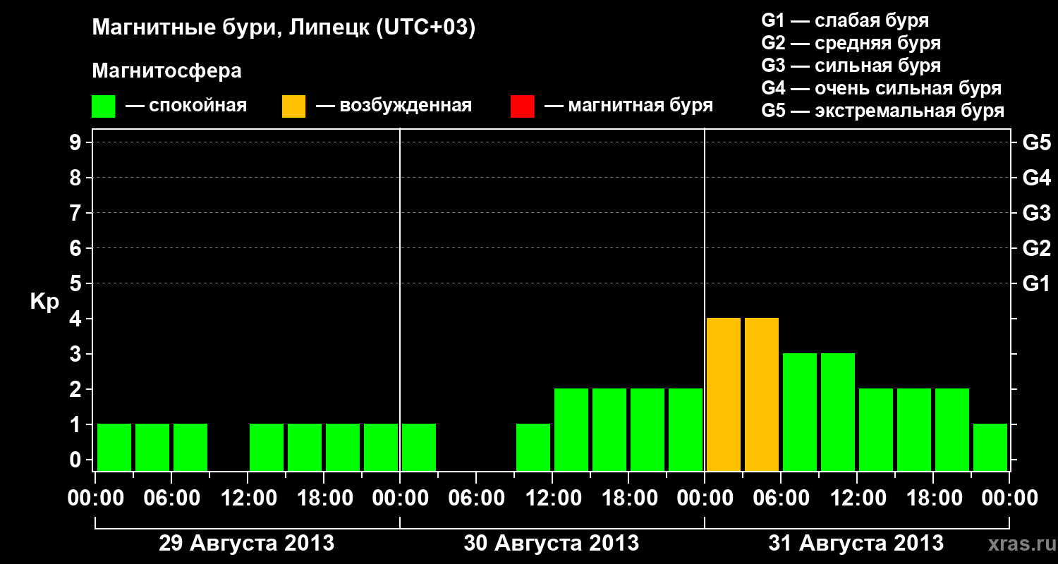 Изменения геомагнитного индекса Kp с 29 по 31 августа 2013 года для средних широт
