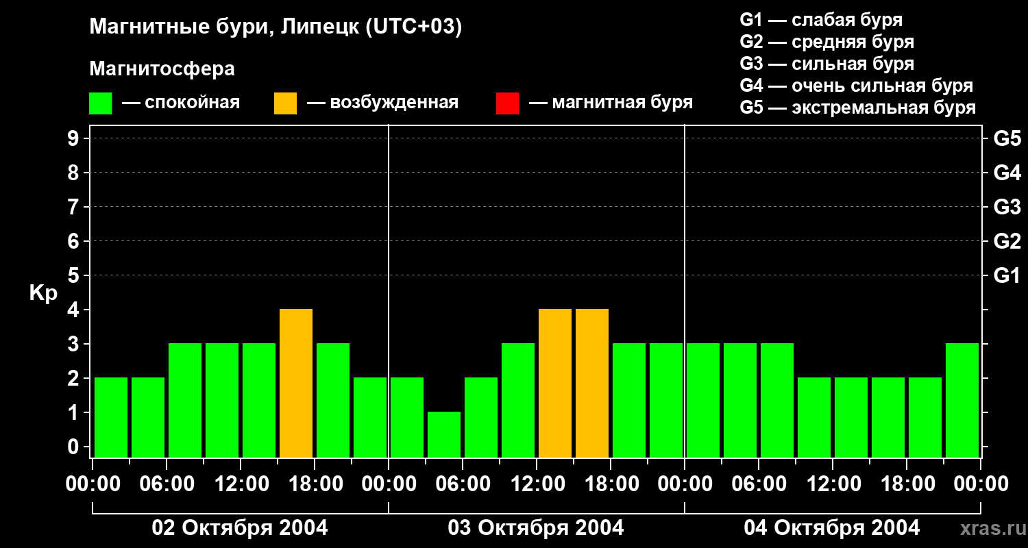 Изменения геомагнитного индекса Kp с 2 по 4 октября 2004 года для средних широт