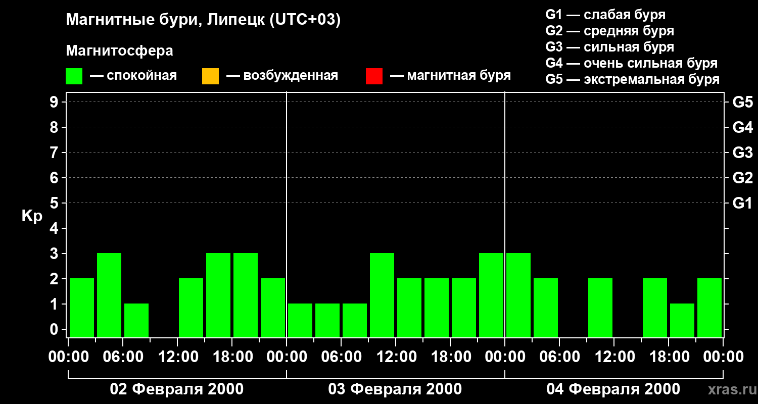 Изменения геомагнитного индекса Kp с 2 по 4 февраля 2000 года для средних широт