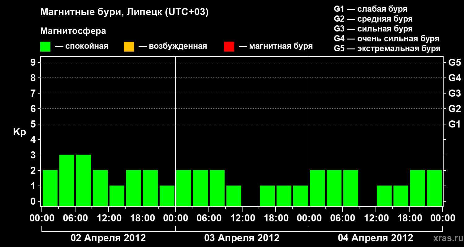 Изменения геомагнитного индекса Kp с 2 по 4 апреля 2012 года для средних широт